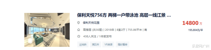 这套法拍房之所以备受关注,主要是因为其稀缺性 。其一,保利天悦是琶洲公认的豪宅,坐拥头排望江位置。其二,1号楼算是小区内的楼王,无遮挡望江,全栋采用一户一层+两梯一户设计,仅有29套房源。