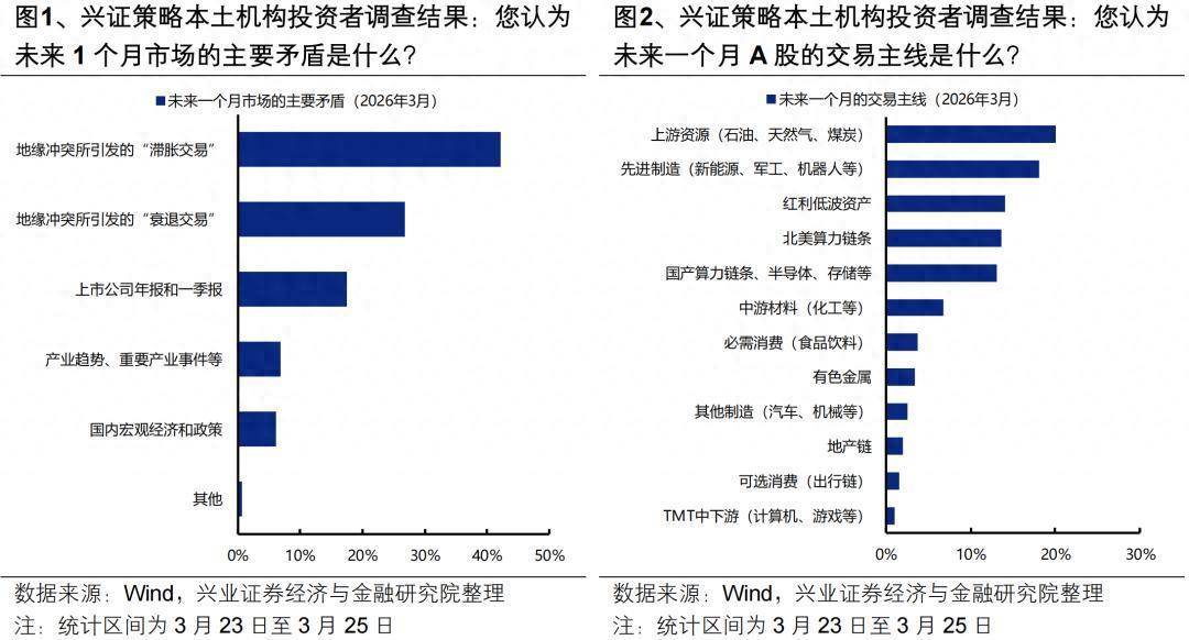 根据该行3月23日至25日针对260+位本土核心投资机构的基金经理、投研负责人与总量研究员的调查结果,当前机构投资者对算力链、先进制造与上游资源一季报景气共识较强。当前机构投资者对一季报业绩共识最强的高景气方向是北美算力链条(26%),其次为国产算力链条、半导体、存储等(17%)、先进制造(新能源、军工、机器人等)(15%)、上游资源(石油、天然气、煤炭)(15%)和有色金属(12%)。